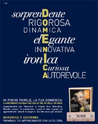 Da domenica 5 dicembre si rinnova l'appuntamento con la cultura del Sole 24 Ore. Il Domenicale cambia nome e si rinova: nella nuova veste grafica le immagini e le fotografie verranno valorizzate al massimo. Il lancio sarà sostenuto da una campagna stampa pinaificata sui mezzi del Gruppo 24 Ore e sui maggiori quotidiani, sia da uno spot radio su Radio 24 e Radio Rai.