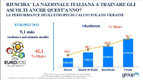 In occasione del calcio d'inizio del grande evento sportivo, prende il via la rubrica, a cura della media holding del gruppo WPP, che fornirà rilevazioni e analisi dei dati di audience, share e numero di tweet, valutando l’impatto mediatico di UEFA Euro 2016, anche con Focus Speciali sui break pubblicitari e sui top brand protagonisti. In attesa di conoscere i primi risultati della copertura a cura di Sky e Rai, ricordiamo i successi dell'edizione 2012: Spagna-Italia, il 1° luglio del 2012, superavano l’80% di share con più di 22 milioni di tifosi, complice anche la presenza della nostra Nazionale. La media televisiva dell’intera competizione registrava un ottimo 42% di share.