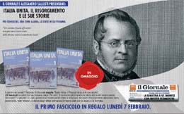 La campagna di promozione dei 19 fascicoli di storia 'Italia Unita. Il Risorgimento e le sue storie', che a partire dal 7 febbraio usciranno in allegato con il Giornale, è pianificata su stampa, su reti Mediaset e radio su RDS e 101.