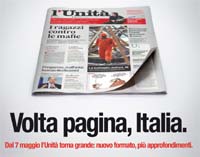 Il visual della campagna è l'immagine stessa del nuovo giornale con un piccolo lembo rialzato, nell'atto del voltare pagina, appunto. Nello spot tv vediamo il giornale, le cui pagine vengono alzate e sfogliate da un leggero vento, mentre la voce fuori campo recita: “Aria di novità nell'informazione, l'Unità torna grande”.