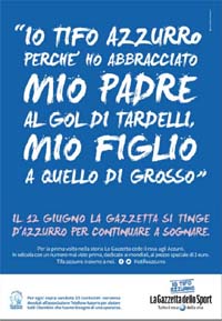 E azzurra non sarà solo la sua carta, ma anche l’iniziativa che La Gazzetta dello Sport sposa: per ogni copia venduta, 10 centesimi saranno devoluti a Telefono Azzurro. Tutti i lettori, nel giorno del fischio d'avvio, partecipano con il loro quotidiano a una grande operazione di solidarietà.