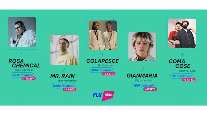 Al secondo posto di questa speciale graduatoria si posiziona Mr. Rain, grazie a una crescita del 98,84% e un +340.000 nuovi follower. Alle sue spalle un terzetto forse poco atteso dai più: Colapesce, gIANMARIA e Coma_Cose (rispettivamente +55%, +53% e +34% di incremento della fanbase), a dimostrazione di come, anche senza grandi acuti in termini di classifica finale, Sanremo rimanga una piattaforma di amplificazione incredibile per questi artisti.