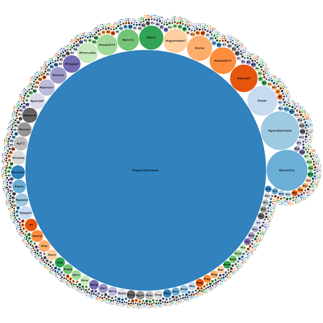Se si analizza, invece, l’utilizzo degli hashtag, la classifica varia. In prima posizione, per popolarità e ripetizione, troviamo: #lagrandebellezza (61.344 utilizzi), #sorrentino (1.777 utilizzi), #grandebellezza (1.582) e #oscar (951).