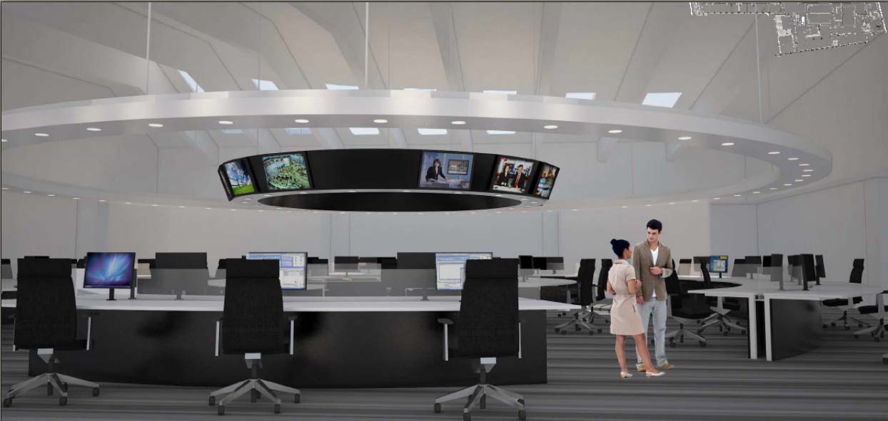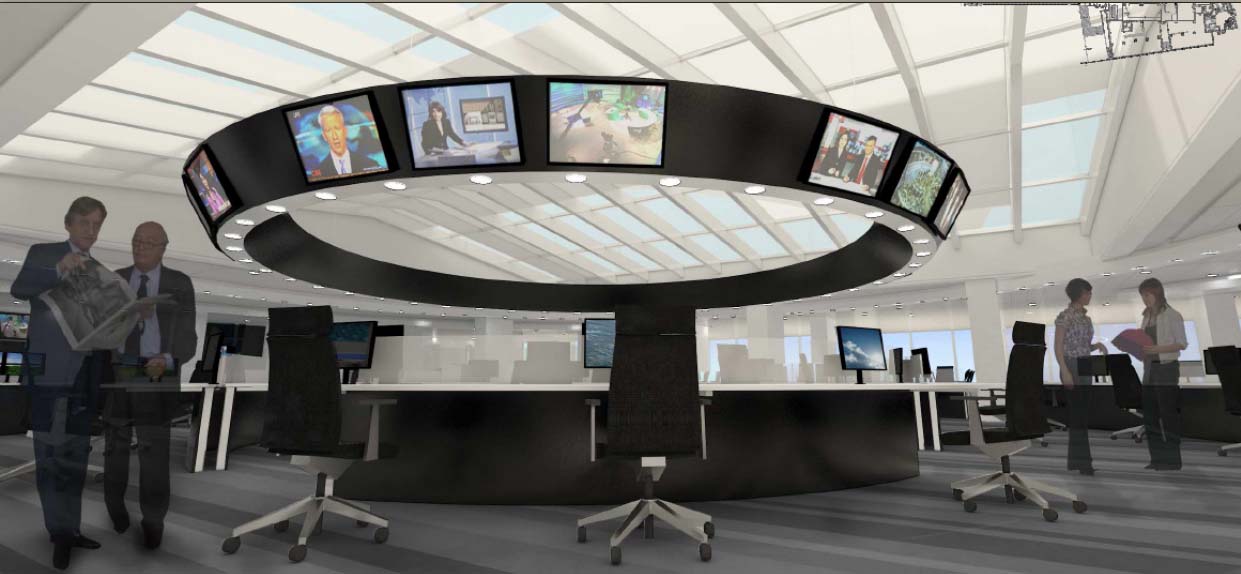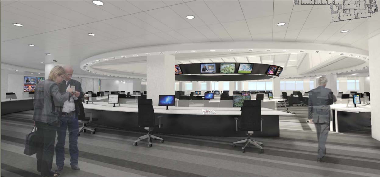 La redazione, a pianta circolare, si svilupperà attorno al desk centrale, presidiato dai caporedattori che coordinano le diverse aree con ambienti caratterizzati da trasparenza e continuità che permetteranno la condivisione sia delle notizie, visibili a tutti sui monitor posti sopra il desk centrale, sia della progressiva composizione del quotidiano grazie ai numerosi monitor 70” presenti in redazione.