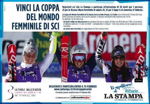 Per celebrare questo avvenimento La Stampa ha deciso di offrire ai lettori appassionati di sci la possibilità di assistere alla gara come ospiti del quotidiano, comodamente seduti in tribuna mettendo a loro disposizione 50 inviti per due persone (25 per la discesa libera e 25 per il Super G) attraverso il concorso “Vinci la Coppa del Mondo di Sci ”.
