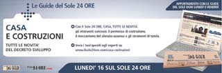 Le Guide del Sole, distribuite gratuitamente con il giornale il lunedì, saranno in edicola anche il venerdì. Da lunedì lo speciale con le novità del decreto legge sullo sviluppo dedicate alla casa. La campagna stampa è pianificata sui mezzi del Gruppo 24 Ore.