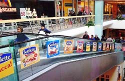 I Totem di Grandicentri, maxi pannelli bifacciali, presidiano ingressi e uscite, cambi di piano, scale mobili e ascensori, anch’essi riproponendo l’allegra nonnina, che con sorpresa ed entusiasmo scopre l’irresistibilità di Sottilette. I Banner sono maxi pannelli aerei sospesi nella mall centrale, che offrono un forte impatto al marchio Sottilette®. I Lumen, impianti girevoli quadrifacciali retroilluminati, irradiano le gallerie dei centri con la creatività della campagna ed assicurano una sensazionale visibilità che rafforza la domination di Sottilette .