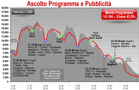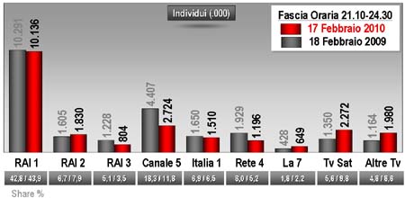 Inoltre la diminuzione del 4% rispetto ai 10,7 milioni della prima serata non solo è fisiologico, ma è stato inferiore a quello dello scorso anno (-11%). Sicuramente anche Bonolis sarà stupito di questi numeri. E’ pur vero che al banchetto allestito dalla Rai, Mediaset ha contrapposto portate da pizzeria. Ma è anche vero che l’odierno menù televisivo è arricchito non solo dal satellite, ma anche dall’offerta del digitale terrestre. (In allegato le tabelle in pdf)