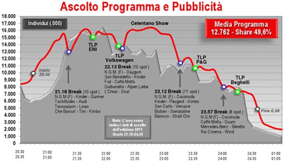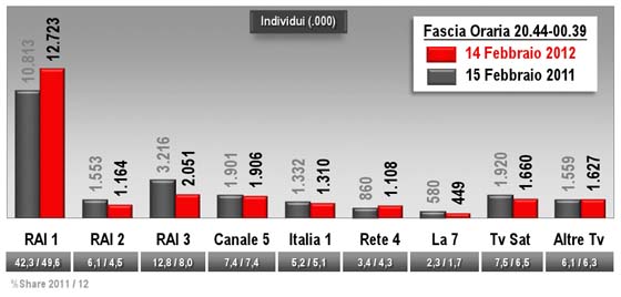 il 50% di share! Quattro punti in più del 2011. Aggiungiamoci una share del 42% tra gli abbonati Sky e del 44% tra chi ha una connessione internet a casa.