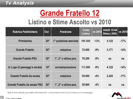 Per amor di statistica, il miglior esordio è stato nella primavera 2004 con quasi 9,4 milioni (+77%). Non è un caso che la stessa concessionaria abbia prodotto delle stime dei break pubblicitari decisamente inferiori a quelle dello scorso anno (dal -11% al -17%). Anche il listino è stato ritoccato al ribasso (dal -4% al -13%).