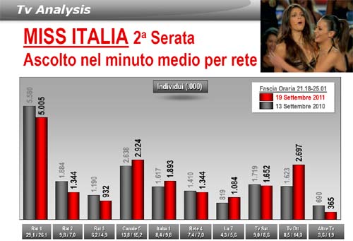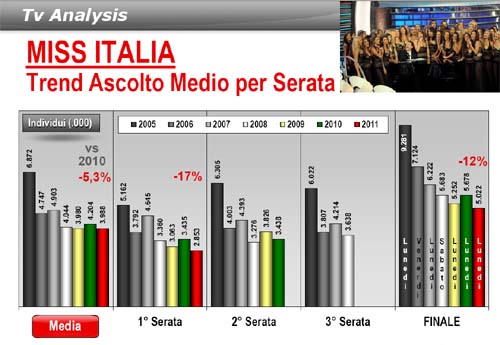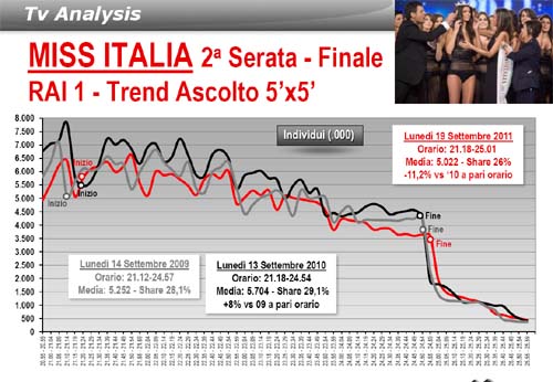 La 72a edizione di Miss Italia registra in totale un calo d'ascolto di oltre il 5% rispetto al 2010. La finale di ieri sera, oltremodo lunga (quasi 4 ore) ha ottenuto solo 5 milioni d’ascolto nel minuto medio, con una share del 26%, il valore più basso della storia e anche i break pubblicitari erano 'scarichi'.