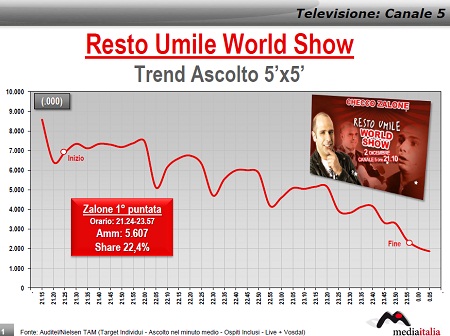 Sarà per questo motivo che il Resto Umile World Show ha raccolto 'solo' 5,6 milioni di Individui nel minuto medio? Dalla curva d’ascolto si nota che dopo 'Striscia la Notizia' una parte del pubblico di Canale 5 ha abbandonato la rete, ma in ogni caso Zalone ha centrato l’obiettivo d’ascolto compreso tra i 5 e i 6 milioni.