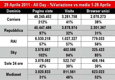 Dai dati Audiweb risulta che il giorno 29 Aprile tutti gli indicatori sono esplosi rispetto alla media dei 28 giorni precedenti.