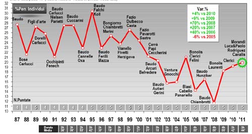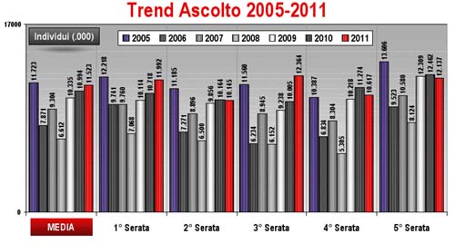 Ascolto. Solo i più inguaribili ottimisti avrebbero potuto pronosticare un simile risultato, sapendo gli effetti che il passaggio al digitale sta provocando sull’ascolto delle reti tradizionali. Come si vede dal grafico, Morandi ha superato del 4% l ’edizione del 2010 targata Clerici, considerata un successo, con grande soddisfazione degli inserzionisti pubblicitari, visto che il listino era aumentato molto pudicamente. Se la quarta serata avesse tenuto un po ’ di più, forse Morandi avrebbe persino insidiato i valori record del 2005. Complessivamente l ’ascolto nel minuto medio è stato di 11,5 milioni con una share del 48,2%. Interessante notare l’elevata share anche tra i segmenti teoricamente meno sensibili a Sanremo: 42,6% tra gli abbonati Sky e 46,4% tra i possessori di connessione ad Internet.