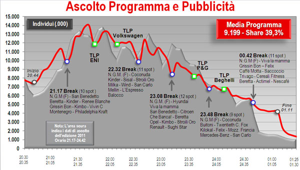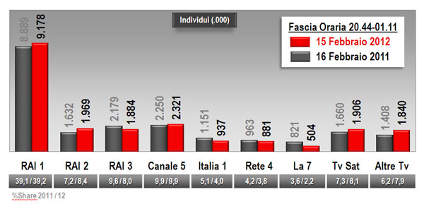 9,2 mln nel minuto medio. Circa 3,5 milioni in meno rispetto alla serata d’esordio. Poco più del 39% di share. Le forti polemiche seguite all’exploit della prima serata sembrano aver danneggiato l’ascolto invece di averlo fatto lievitare. Tuttavia, storicamente la seconda serata registra un forte calo rispetto alla prima. Sul 2011, a parità di orario, il calo è modesto: -3%. Inoltre, c’era la Champions League. Tenendo conto che ieri sera le canzoni hanno ripreso totalmente la scena, si tratta di un ottimo risultato in tempi di frammentazione della platea su centinaia di emittenti.
