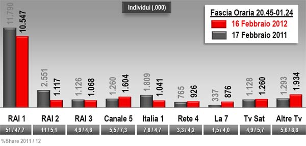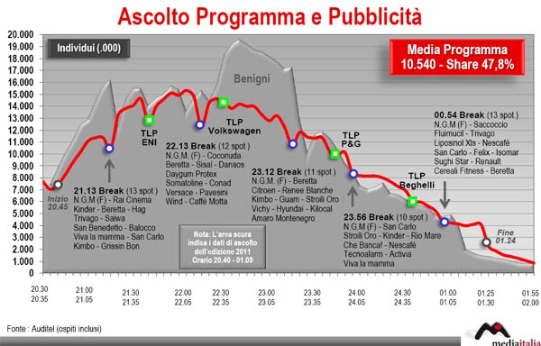 E’ tanto o è poco? Rispetto alla seconda serata la share è cresciuta di quasi nove punti e l’ascolto di ben 1,3 milioni. Chi facesse il confronto con il 2011, invece, osserverebbe un notevole calo (l’ascolto era stato di 12,4 milioni con il 50,9% di share). Non si dovrebbe dimenticare, però, l’onda anomala che aveva caratterizzato quella serata: Roberto Benigni con l’esegesi dell’inno nazionale e i consueti lazzi sul premier dell’epoca. Nei 50 minuti di monologo (come Celentano, quindi è un format!), l’ascolto medio era stato superiore ai 18 milioni con un picco di quasi 20 milioni (meglio di Celentano).