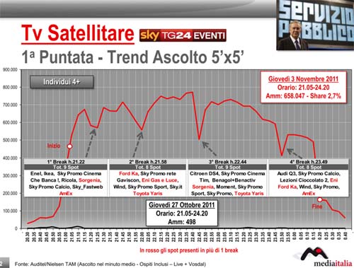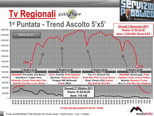 Pubblichiamo i dati e il commento sugli ascolti tv della prima puntata del nuovo programma Servizio Pubblico di Michele Santoro, elaborati da Media Italia per ADVexpress. Oltre 2,2 milioni l’ascolto nel minuto medio sulle tv regionali (vedi documento allegato) e oltre 640mila i telespettatori su Sky Tg24 Eventi (target individui con più di 4 anni). Il confronto con il giovedì precedente è imbarazzante, tanto che non è serio calcolare le variazioni percentuali.