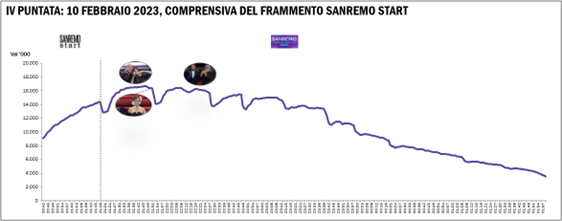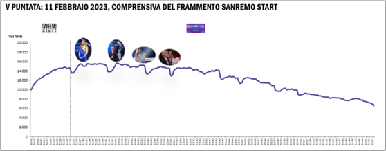 L’intera edizione 2023 (7-11 Febbraio) ha sintonizzato all’ascolto ben 10,8 milioni di spettatori con una share del 63,1%. Ascolto in calo del -3,6% vs stagione precedente ma share (quella K per doverosi confronti metodologici) in crescita di circa 2 punti percentuali: dal 61,4% al 63,1%. Interessante anche l’incidenza degli ospiti: +7,4%. In leggero calo (-2,2%) – in termini di audience – i giovani 18-34 ma con una share media ragguardevole: 70,4%.