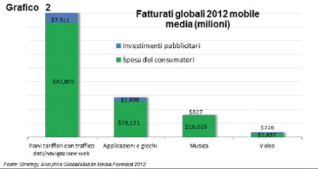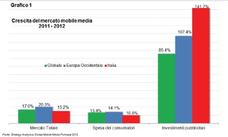 Il 2011 è stato il primo anno in cui la spesa globale da parte degli utenti finali in contenuti multimediali, applicazioni e servizi per i telefoni cellulari ha sfondato la barriera dei 100 miliardi di dollari. Secondo le ultime stime Global Mobile Media di Strategy Analytics, ci si aspetta da parte degli utenti finali un incremento della spesa sui contenuti mobile di un ulteriore 13,4% per passare dai 121,8 miliardi di dollari del 2011 a 138,2 miliardi dollari nel 2012.Gli investimenti in pubblicità da parte delle aziende, invece, si prevede che possano quasi raddoppiare (85,4%) passando da 6,3 miliardi di dollari a 11,6 miliardi dollari di spesa, risultando così in un incremento dei fatturati globali del settore dei Mobile Media del 17,0% rispetto al 2011, a raggiungere i 149,8 miliardi dollari di fatturato nel 2012 (vedi grafico 1).