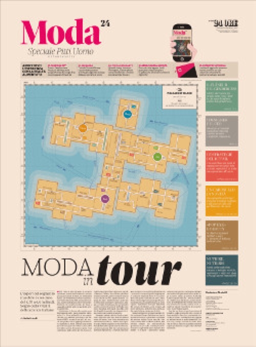 L’app Moda24 consentirà di fruire contenuti aggiuntivi attraverso iPhone e apparecchi Android. Basterà scaricarla, inquadrare i marker rosa, toccare il pulsante e poi leggere, guardare e ascoltare.