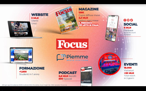 Focus, con le sue declinazioni, è il brand leader nel settore della divulgazione in Italia con una fanbase di oltre 6 milioni di utenti (social account + creator Focus), più di 3 milioni di utenti unici (fonte: Shareablee, 2022), una diffusione mensile di oltre 136.000 copie (fonte: Ads, gennaio - agosto 2023) e più di 3,3 milioni lettori ogni mese (fonte: Audipress 2023/2). Il periodico più letto in assoluto in Italia, diretto da Raffaele Leone, da più di 30 anni è il punto di riferimento per tutti gli appassionati e i curiosi dei temi scientifici: dalla tecnologia alla sostenibilità, dalla robotica alla medicina, dalla ricerca sull’IA fino alle missioni spaziali e la natura. Un sistema editoriale unico declinato in varie aree tematiche e diversi canali tra magazine, siti web, account social, video talks e podcast. Completano l’offerta editoriale anche un canale televisivo, un’esclusiva accademia per gli studenti interessati al giornalismo scientifico e, infine, anche un grande evento incentrato sulla divulgazione scientifica: Focus Live.