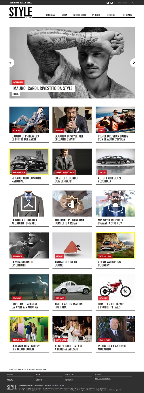 Il nuovo canale di corriere.it offre immagini, tutorial, news, indirizzi, suggerimenti e i pratici consigli di Mr. Style, consulente di stile. “Abbiamo proposto style.corriere.it ai nostri migliori clienti” - aggiunge Raimondo Zanaboni, Direttore Generale Pubblicità di RCS MediaGroup - “incontrando subito molti apprezzamenti per l’esclusiva formula editoriale. Tutta la fase di lancio del sito per le prime due settimane vedrà la sponsorship di Maserati, che ha scelto formati di alto impatto come skin, halfpage e pushbar. Partiamo inoltre subito con due operazioni di native advertising insieme a Jacob Cohen e Volvo, a cui ne seguiranno diverse altre nelle prossime settimane. Style.corriere.it rispecchia dunque le migliori caratteristiche di successo del magazine maschile di Corriere, ampliando le opportunità di comunicazione per marchi non solo della Moda uomo, ma di tutto l’universo dei consumi maschili orientati all’eccellenza e alla qualità.”