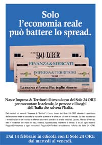 Il Sole 24 Ore 'si fa in tre' e lancia dal 14 febbraio 'Impresa&Territori', il terzo dorso che dal martedì al venerdì racconterà le aziende, le sfide, i mercati, le persone e i luoghi dell’Italia che si salva, quella dell’economia reale che può battere lo spread e trainare il Paese fuori dalle secche della crisi.