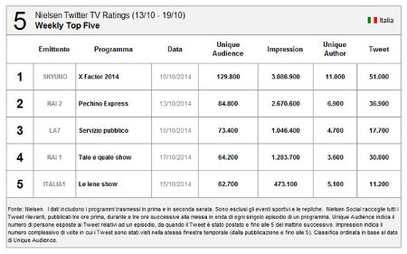 La classifica si basa sui dati di Nielsen Twitter Tv Ratings, il primo strumento di misurazione delle attività totali (tweet, unique author) e della reach (impression, unique audience) relative ai tweet sui programmi tv.