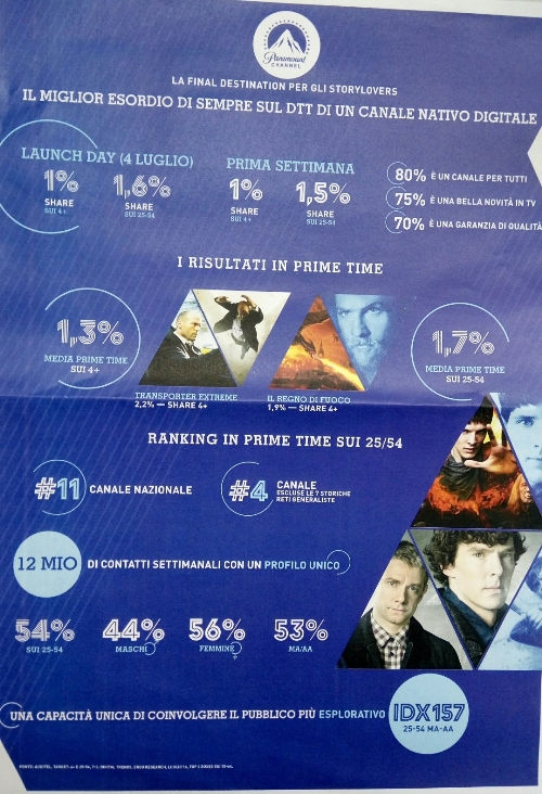 Paramount Channel, prima settimana di Auditel: 1% di share e 1,7% in prime time sui 25-54enni. Per lo sviluppo commerciale si punta sulle 'iniziative speciali'