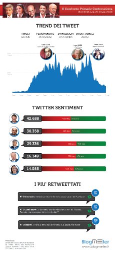 Nell’arco della giornata di ieri il volume totale dei tweet riguardanti il dibattito è stato pari a 147.162, il 67% dei quali contiene almeno uno dei due hashtag principali utilizzati per aggregare le discussioni. Restringendo l’analisi al periodo che va da mezz’ora prima a mezz’ora dopo la messa in onda emerge la pubblicazione di 127.426 tweet, con una media di 927 tweet al minuto e con tre picchi di oltre 1.500 tweet al minuto. I “twittatori” unici sono risultati essere 21.072 ed hanno generato un numero di impression, ossia il numero di persone, non uniche, potenzialmente raggiunte dai messaggi scritti, pari a circa 180 milioni. Un primato per una trasmissione televisiva italiana , che scalza il precedente record di oltre 100.000 tweet fatto registrare dal terzo live show di X Factor, che vedeva protagonista la popolare teen band One Direction che spopola su Twitter.