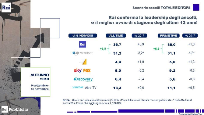 Per Rai miglior avvio di stagione degli ultimi 13 anni: per il Gruppo 36,7% di share nel totale giornata e 38% in prima serata