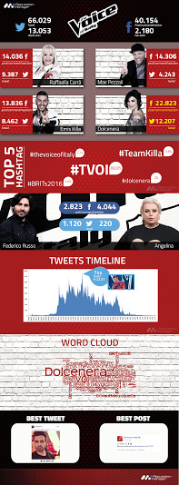 I 5 hashag più utilizzati sono stati #tvoi (88,8%), #TeamKilla (3,9%), #thevoiceofitaly (2,7%), #BRITs2016 (2,6%), e #dolcenera (2%).