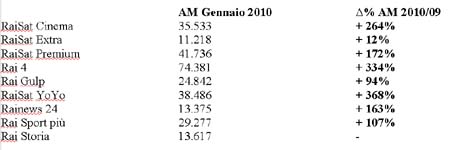 Gli ascolti tv del 2009 vedono Rai leader dell'offerta generalista anche in autunno, per la 13ª garanzia consecutiva, con una share del 39,4%, confermata anche nel primo mese del 2010. Stesso successo per i canali tematici: con Raisat Cinema, Raisat Extra, Raisat Premium, Rai 4, Rai Gulp, Raisat YoYo, Rainews 24, Rai Sport Più, Rai Storia, la share Rai è salita dall'1,2% dell'autunno al 2,6% di gennaio, superando i primi nove canali di Sky e i nove di Mediaset. Ma è nella prova del DTT che i canali specializzati di Rai registrano crescita a due e tre cifre rispetto allo scorso anno: