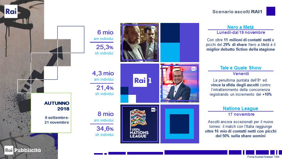 Rai 1 è anche leader nello sport, gli investimenti calcistici costituiscono infatti una costante nel palinsesto settimanale della rete con la Champions League, la novità Nations League e le immancabili amichevoli della Nazionale che hanno contribuito a ringiovanire il pubblico di Rai1: il mercoledì sera la composizione dei 25/54 anni è migliorata di ben 7 punti rispetto al periodo omologo, raggiungendo picchi di ascolto di 8,5 milioni di telespettatori con la Nazionale e di 6,3 milioni con la Champions.