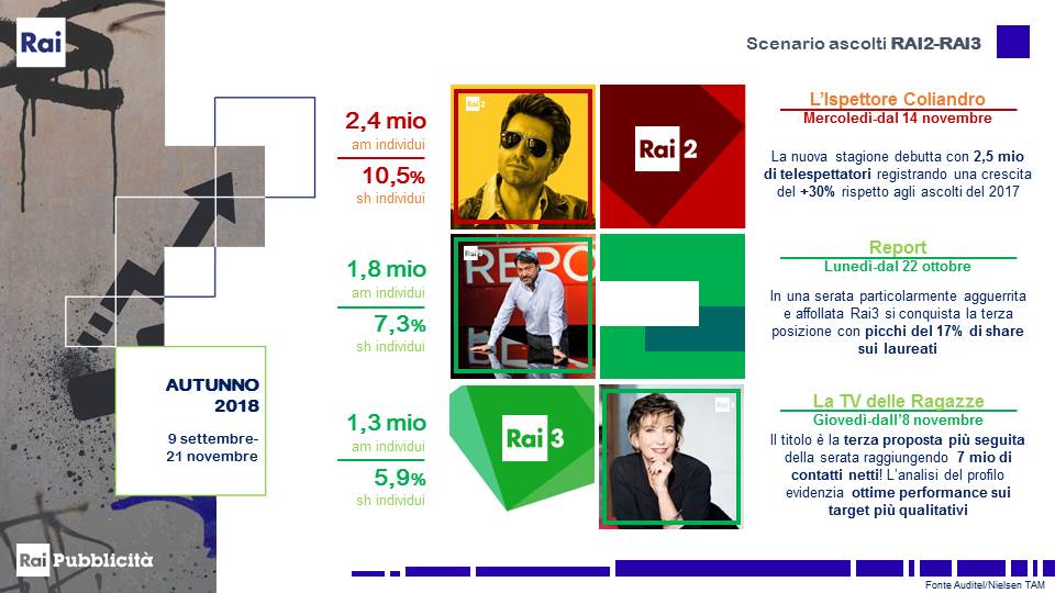 Rai2 dal canto suo ha consolidato l’appuntamento del mercoledì sera con la fiction grazie alla seconda stagione di “Rocco Schiavone” che ha chiuso con una media di 2,8 milioni di individui e il 12% di share e con il ritorno de “L’Ispettore Coliandro” che sta registrando ascolti superiori del 30% rispetto alla passata stagione.