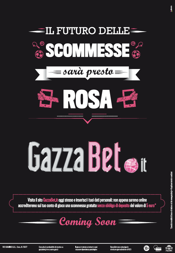 Il workshop Ambrosetti è stato anche l'occasione per rivelare il debutto a giorni dell'agenzia di scommesse sportive interna a Rcs: Gazzabet. "Nei prossimi giorni parte, tempo pochissimi giorni", ha detto Jovane. "Il fornitore era di Tel Aviv e, nonostante la situazione in Israele, in questi due mesi ha mantenuto l'impegno di rilasciare la piattaforma, riuscendo a lavorare in quelle condizioni - ha spiegato - è per rispetto nei loro confronti che non ho parlato". A supporto del lancio una campagna firmata da un'agenzia, di cui ancora non è dato sapere il nome, selezionata tramite gara. Attualmente l'iniziativa è stata protagonista di una fase teaser firmata PBcom.