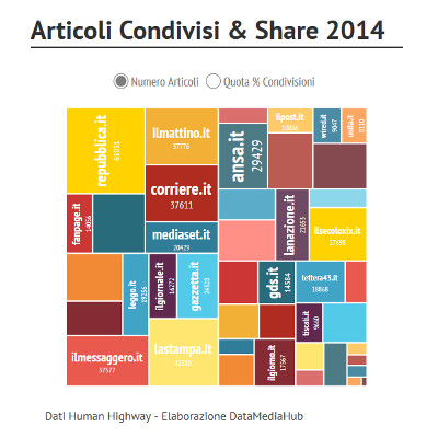 Lo rivela una ricerca condotta da Human Highway relativa al 2014, pubblicata da DataMediaHub. Da soli questi cinque giornali rappresentano circa il 45% del totale delle condivisioni delle 40 testate monitorate. Le condivisioni avvengono per oltre il 90% dei casi su Facebook. Twitter ed ancor più G+ hanno un ruolo marginale.