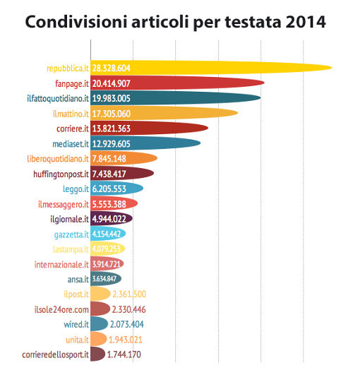 I dati delle condivisioni sono la somma di tutte quelle rilevate per ogni articolo pubblicato nel 2014, ossia la somma dei numeri che compaiono nei box di condivisione associati a ogni articolo pubblicato dalla testata nel 2014.