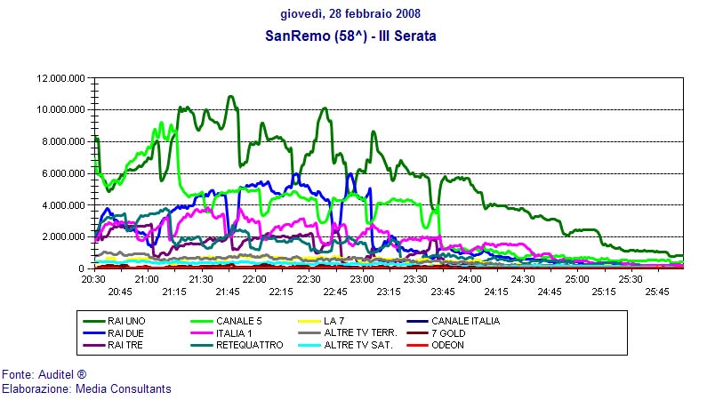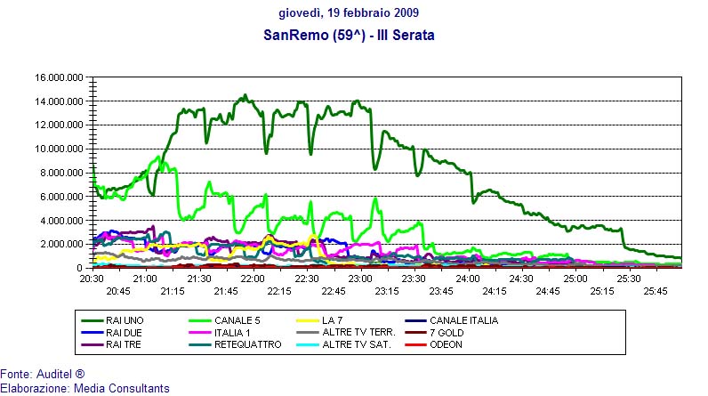 Un risultato importante quello ottenuto da Bonolis con una serata di grande musica, in una delle serate piu' difficili per il festival dal punto di vista della concorrenza televisiva, che vedeva su Canale 5 lo show 'Scherzi a parte', che si e' dovuto accontentare pero' del 15,62% (nel grafico sottostante l'audience delle varie reti a confronto).