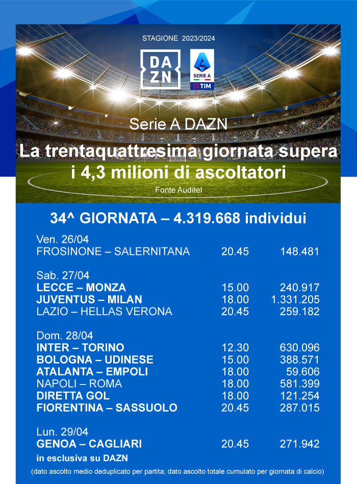 La trentaquattresima giornata della Serie A DAZN supera i 4,3 milioni di ascoltatori. Il big match di giornata Juventus-Milan ha raggiunto più di 1,3 milioni di ascoltatori.