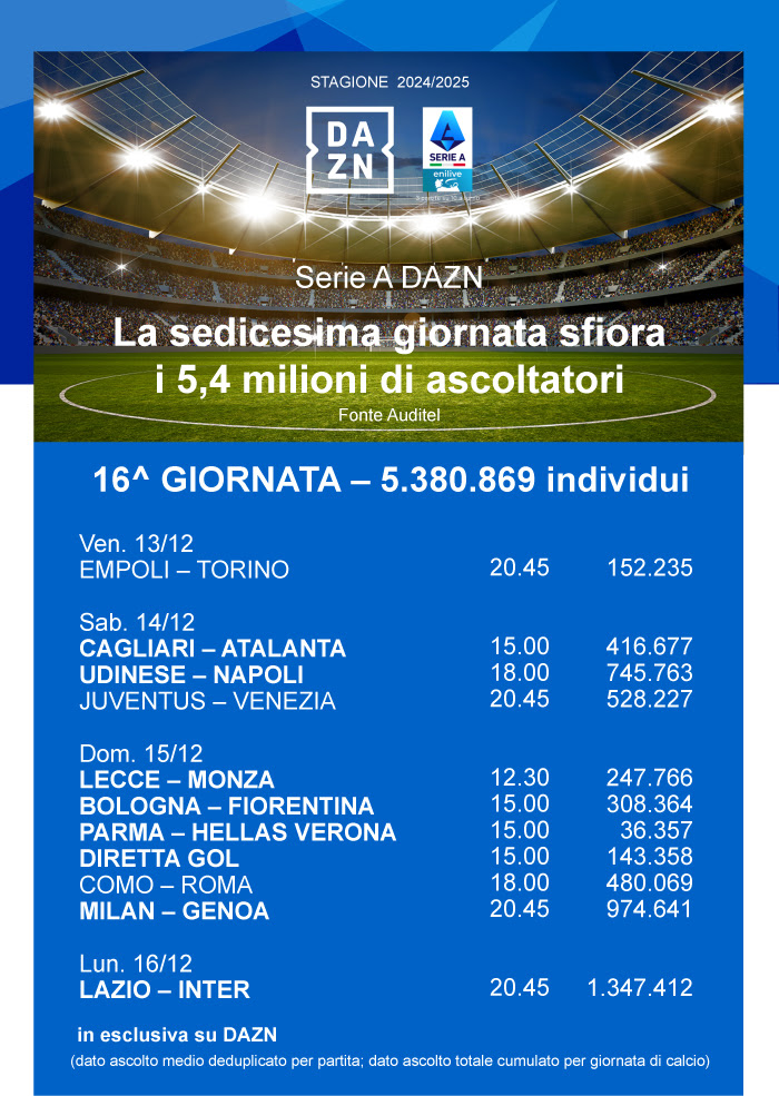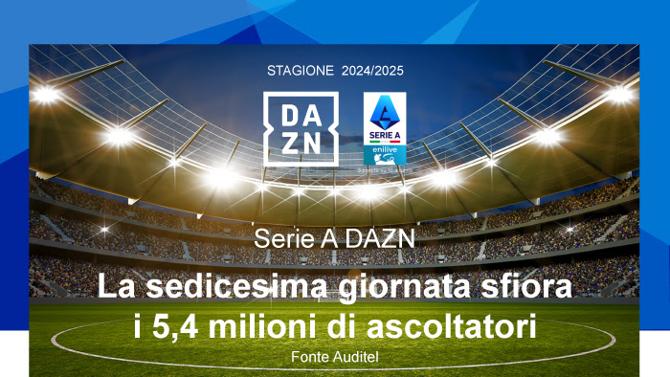 La sedicesima giornata della Serie A DAZN sfiora i 5,4 milioni di ascolto.