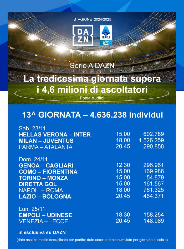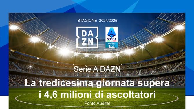 La tredicesima giornata della Serie A DAZN supera i 4,6 milioni di ascolto. Il big match di giornata