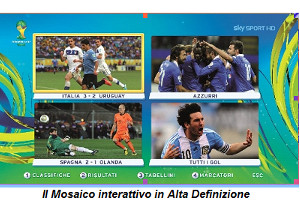 Il Mosaico interattivo in Alta Definizione offrirà come sempre agli abbonati la possibilità di personalizzare ulteriormente la visione: 4 finestre con le partite live, tutti gli aggiornamenti sugli azzurri e una collezione di gol mondiali. Non mancheranno le classifiche aggiornate, i risultati, i tabellini e i marcatori del torneo.