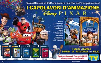 Dal 19 aprile in edicola con il settimanale Mondadori, 12 dvd Disney Pixar, nati dall’unione fortunata della Disney con la tecnologia grafica innovativa della Pixar. Tutte le uscite, con cadenza settimanale, saranno in edicola al prezzo di 18,90 euro (rivista inclusa), ad eccezione dell’ultima, a 14,90 euro (rivista inclusa).
