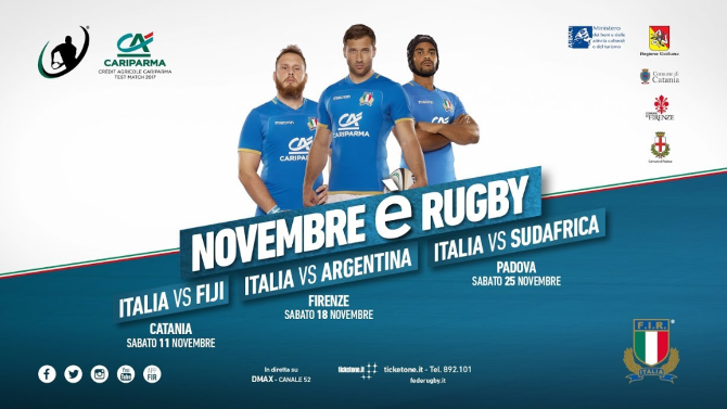 Questo il menù ovale tutto da seguire: si parte sabato 11 novembre a Catania con Italia-Fiji; la sfida si sposta al Franchi di Firenze sabato 19 novembre per Italia-Argentina; il trittico si conclude con la sfida regina contro gli Springbocks sabato 25 novembre all’Euganeo di Padova. Tutto in diretta con collegamento dalle ore 14:15 e fischio d’inizio ore 15:00.