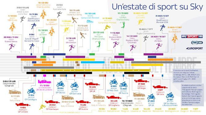 Non mancherà neanche il grande calcio con le Qualificazioni ai Mondiali FIFA 2018. Tutto questo su Sky Sport HD. E su Eurosport arrivano il Tour de France e la Vuelta di ciclismo e i Mondiali di nuoto e di atletica, mentre Fox Sports HD prepara un’estate di rally, baseball MLB e atletica, con la Diamond League in primo piano.