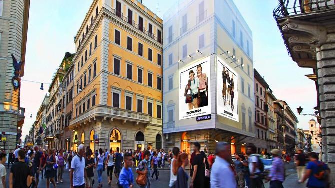 Prestigiosa anche la posizione della maxi affissione di Roma, on air fino a dicembre 2016, situata a pochi metri da Piazza di Spagna, nel crocevia tra Via del Corso e alcune delle celebri dello shopping romano: Via Condotti, via Frattina, Via Borgognona, Via della Croce, Largo Goldoni.