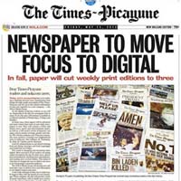 Il Times-Picayune di New Orleans tornerà in edicola quotidianamente. Una scelta, secondo il New York Times, che dimostra la sventatezza nel rinunciare troppo facilmente alla versione cartacea, dettata dall’arroganza degli editori, che credevano bastasse avere il monopolio dell’informazione in un’area per continuare ad avere successo, puntando a conquistare gli inserzionisti con i click.