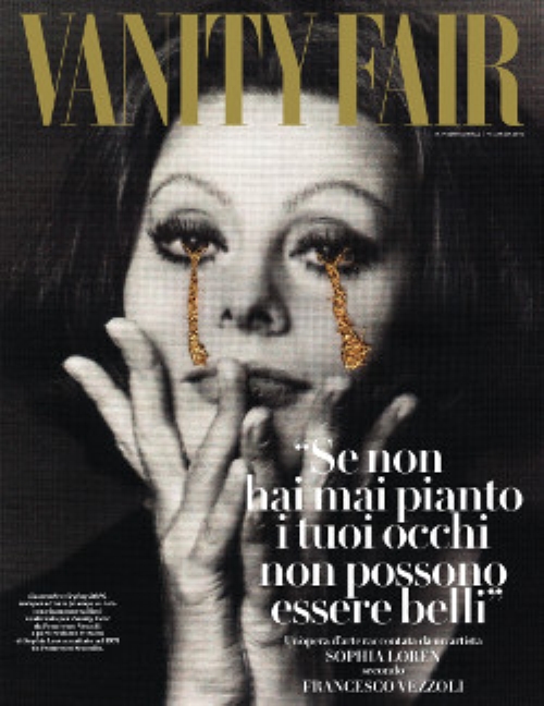 La copertina di questo numero “speciale” è dedicata all’icona del fascino italiano: Sophia Loren. “Francesco Vezzoli è famoso per le sue madonne piangenti. Ritratti di dive stampati su tela, con lacrime di filo metallico ricamate a mano”, dice Luca Dini, che proprio con questo numero celebra dieci anni alla direzione di Vanity Fair. “Usando come base un indimenticabile scatto di un altro Francesco - Scavullo - Vezzoli ha realizzato per Vanity Fair l’opera che vedete in copertina. E poi, lui in redazione, lei al telefono dalla casa di Ginevra, le ha ricordato una sua bellissima vecchia frase - per restare in tema di lacrime: «Se non hai mai pianto, i tuoi occhi non possono essere belli» - e da lì è partita l’intervista”.