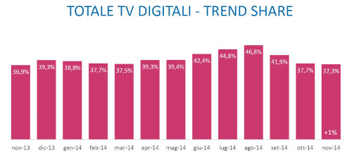Del 37.3% di share complessivo registrato dalle tv non generaliste circa il 32.3% appartiene ai canali del gruppo Tv digitali (terrestri e satellitari, esclusi i canali pay Sky+Fox) che crescono del +1% rispetto a novembre 2013.